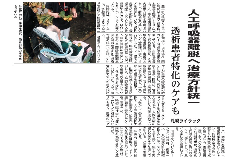 北海道医療新聞にて「人工呼吸器離脱・透析患者のケア統一」について掲載されました。 内容は添付ファイルをご覧ください。 ・北海道…